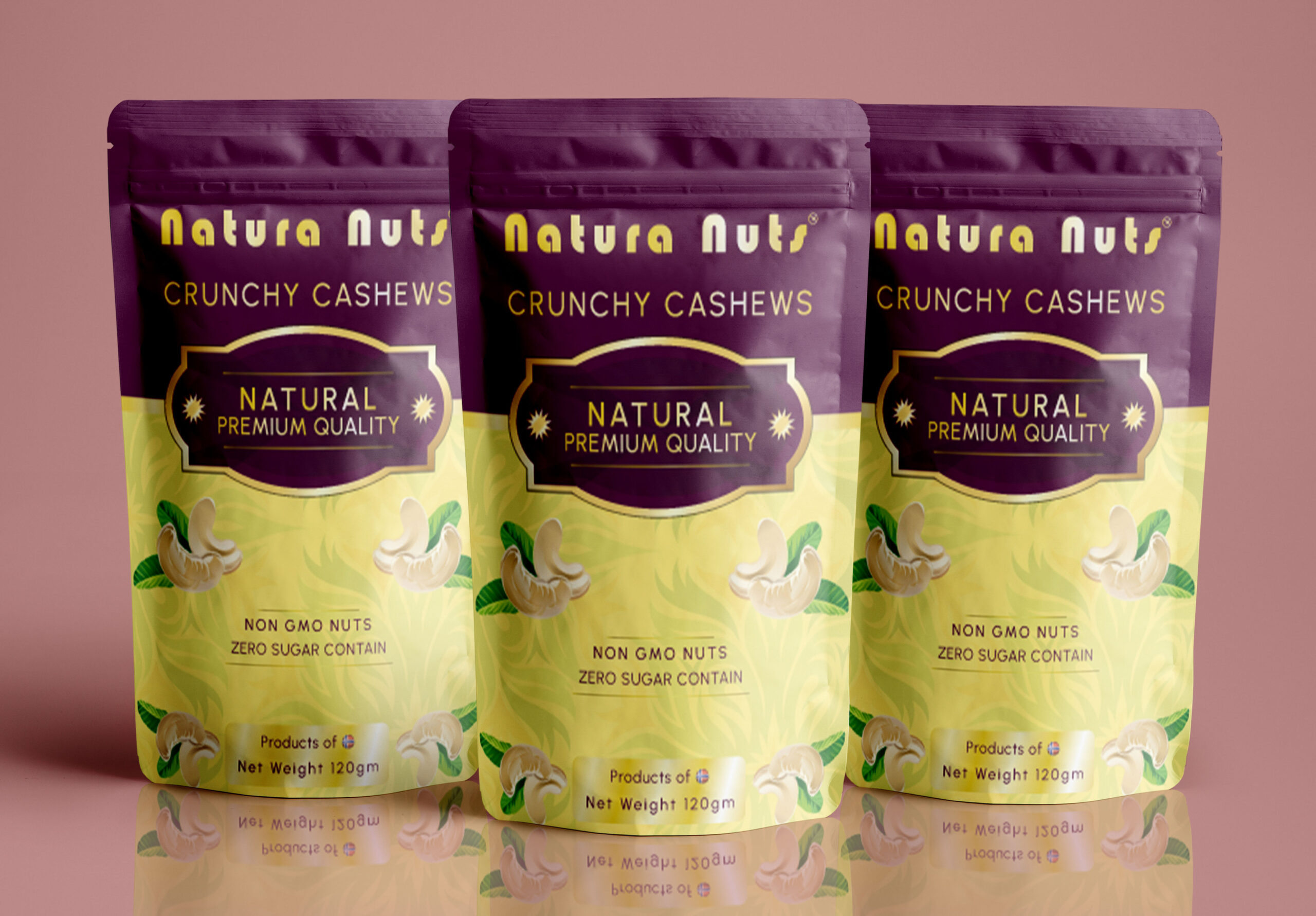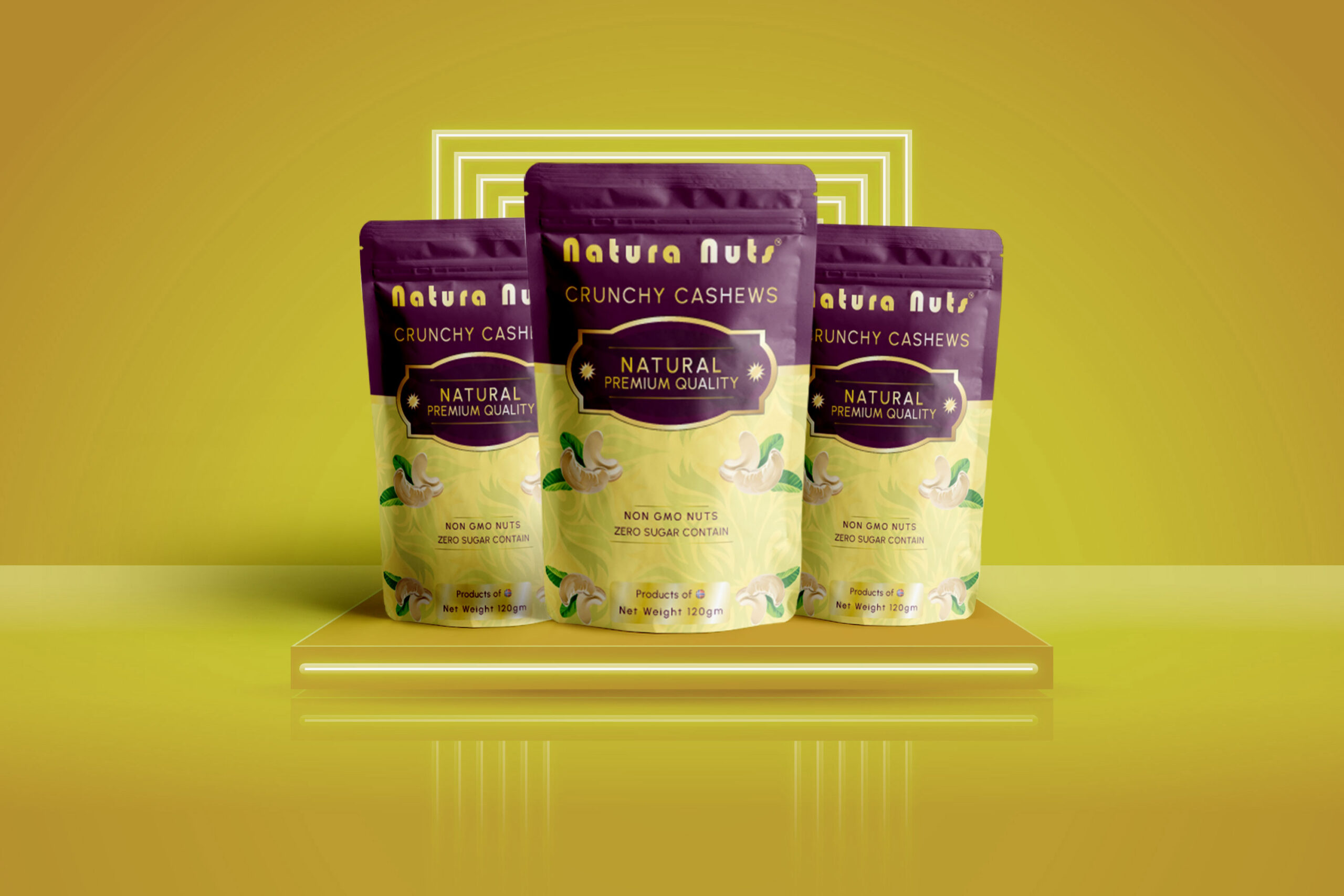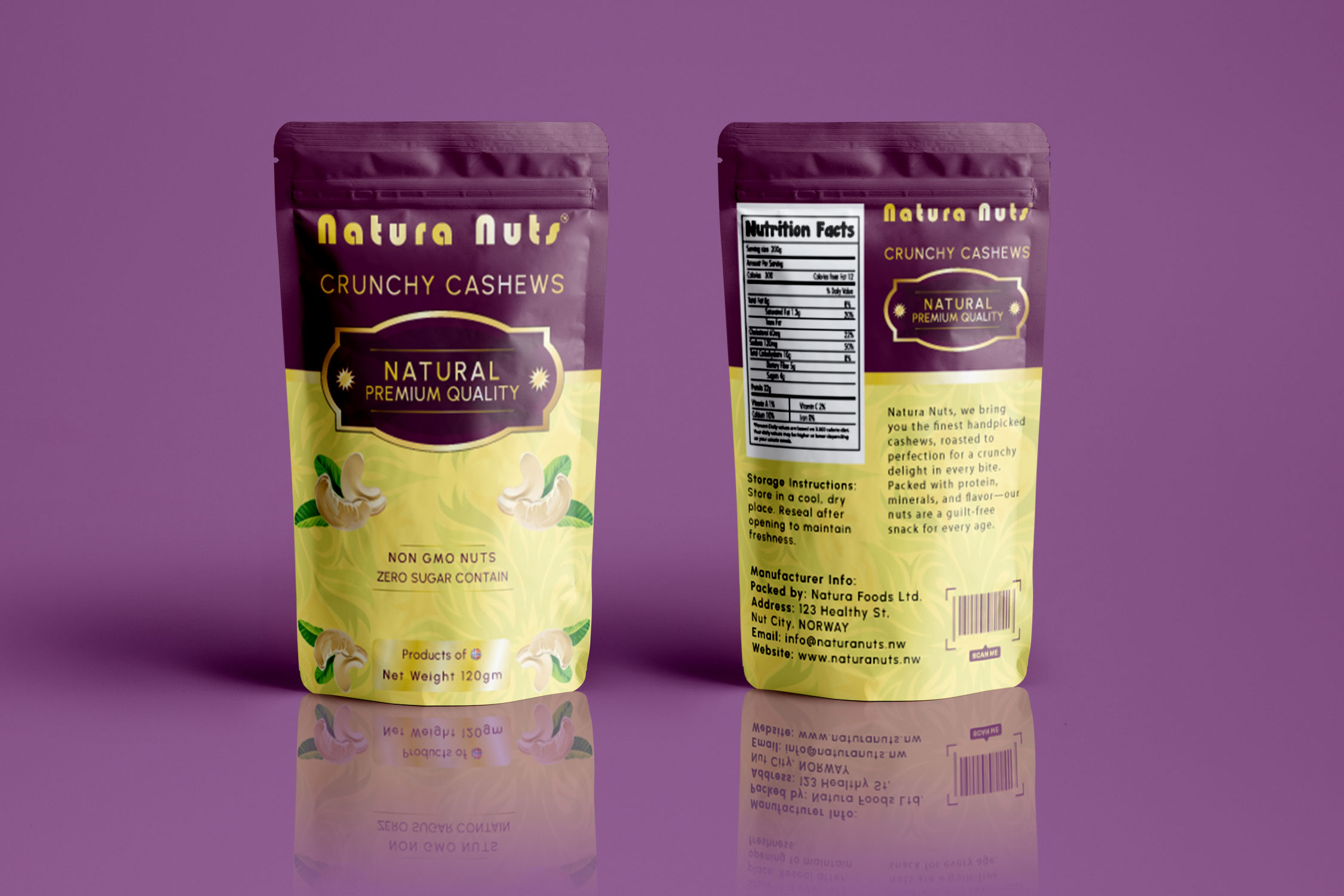 This pouch packaging design was created for a premium cashew nut brand aiming to highlight the natural, organic quality of its product. The goal was to create a simple, modern, and clean aesthetic that communicates trust, health, and taste at first glance.
